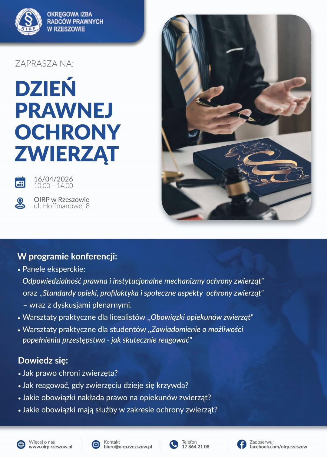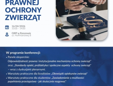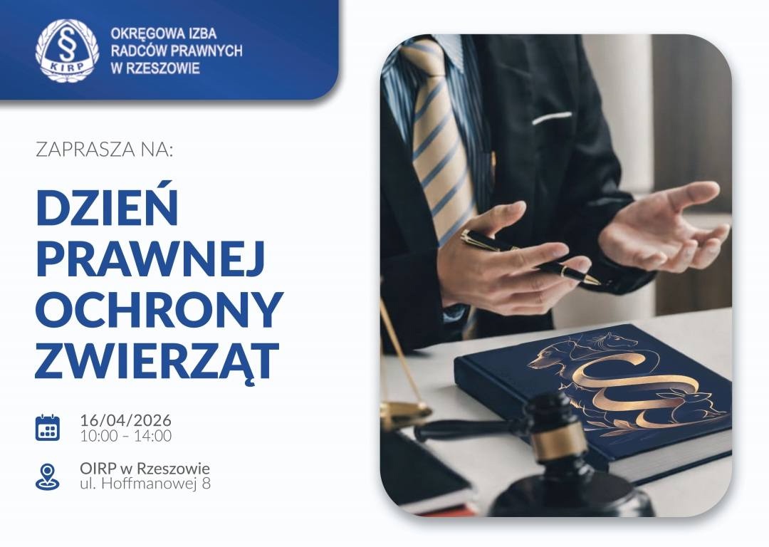 Okręgowa Izba Radców Prawnych w Rzeszowie zaprasza wszystkich mieszkańców Rzeszowa i okolic do udziału w otwartym wydarzeniu: Dniu Prawnej Ochrony Zwierząt, który odbędzie się 16 kwietnia 2026 r. o godz. 10:00 w siedzibie OIRP w Rzeszowie przy ul. Hoffmanowej 8.