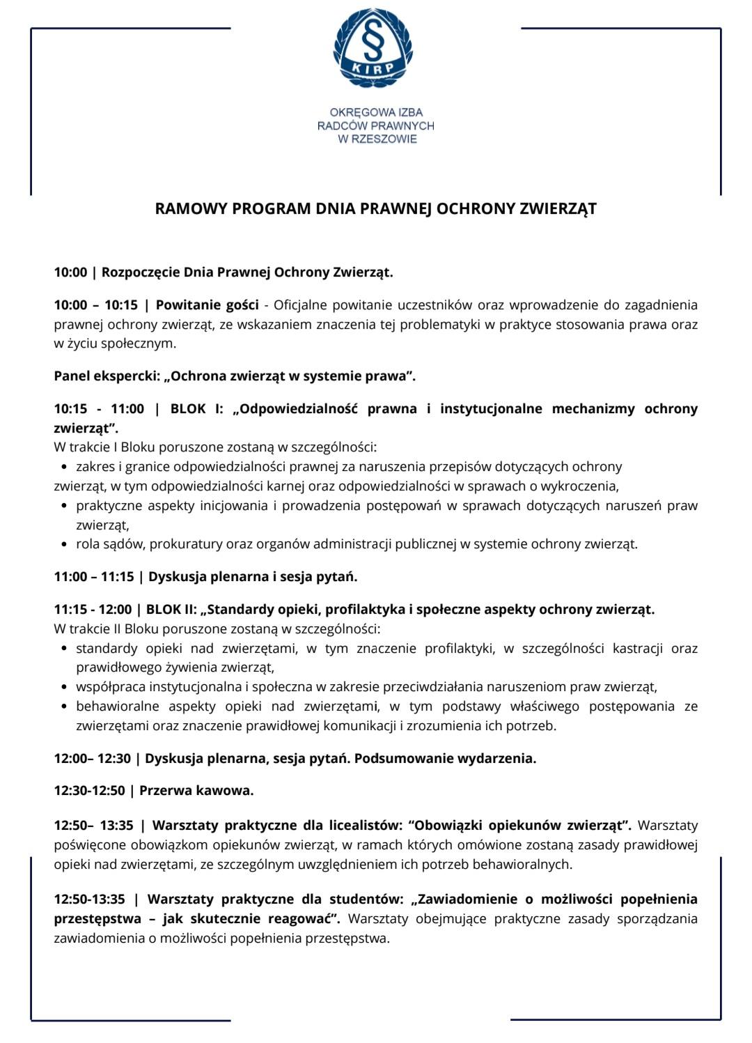 Szczegółowy harmonogram na grafice! wydarzenie objęte patronatem: Prawnicy na Rzecz Zwierząt