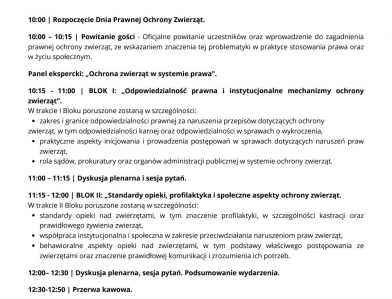 W programie wydarzenia przewidziano panele eksperckie i warsztaty praktyczne, poświęcone m.in. odpowiedzialności prawnej za krzywdzenie zwierząt, standardom opieki, profilaktyce, społecznym aspektom ochrony zwierząt oraz praktycznym sposobom reagowania na przypadki naruszeń.